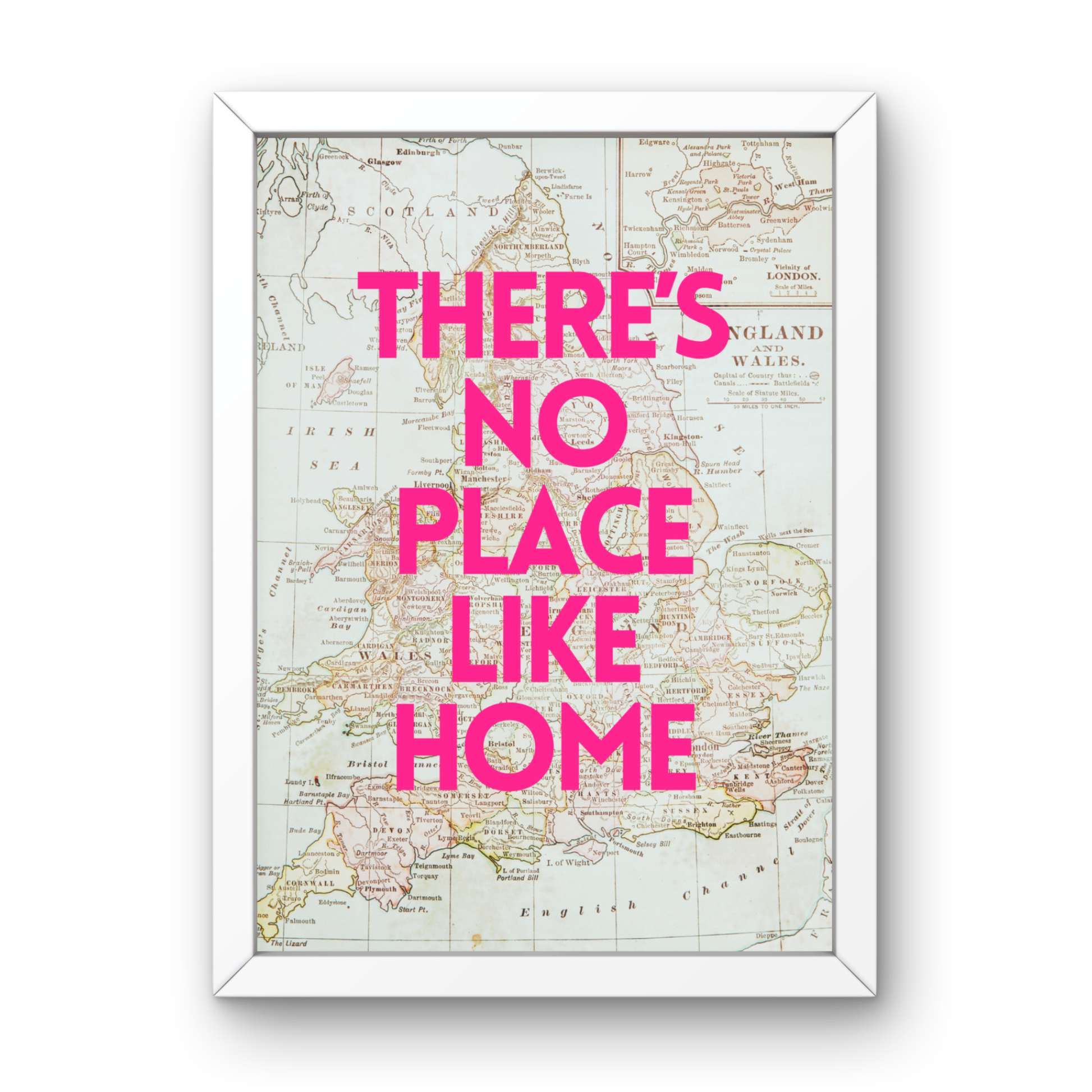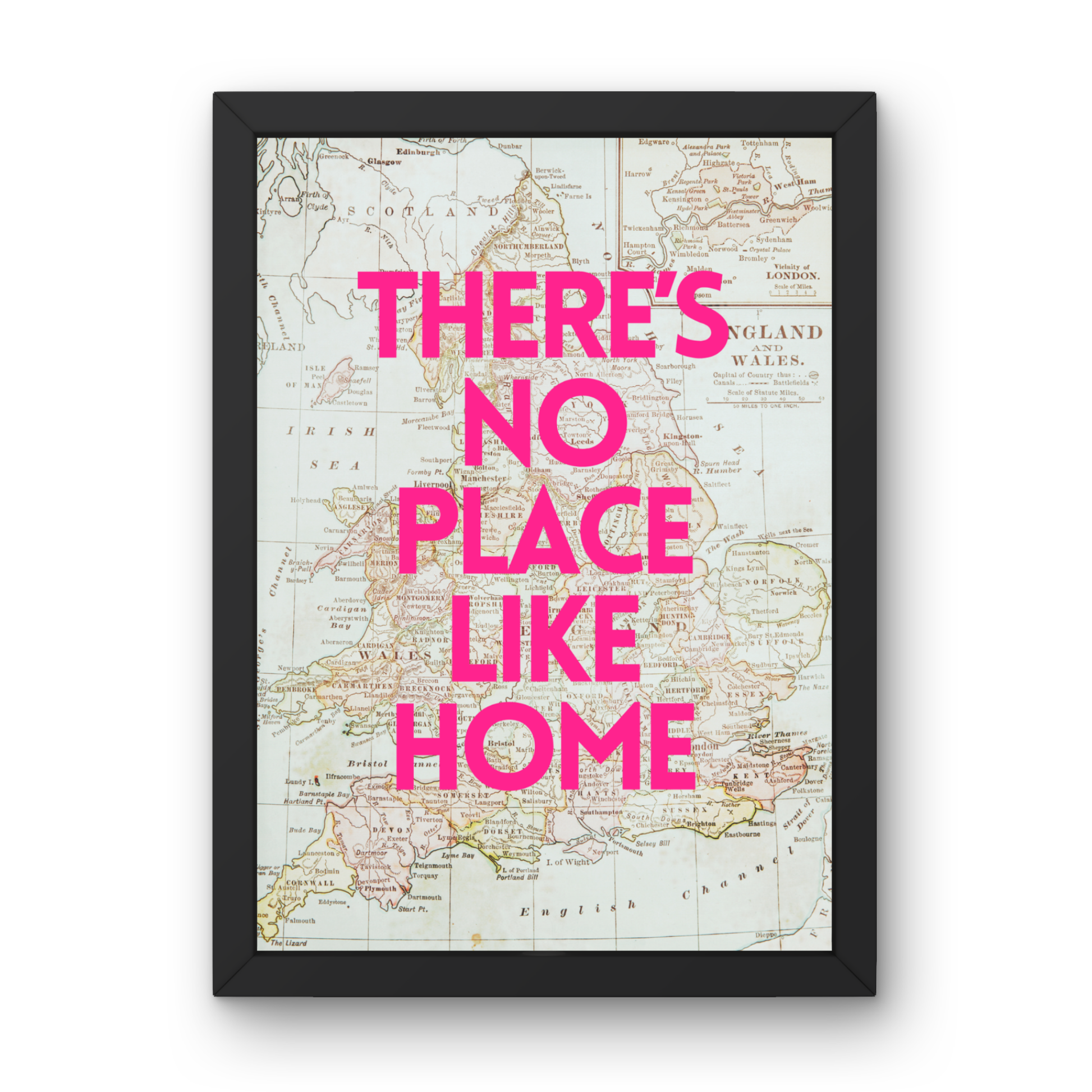 A bold twist on a classic. Bright pink lettering over a vintage map of